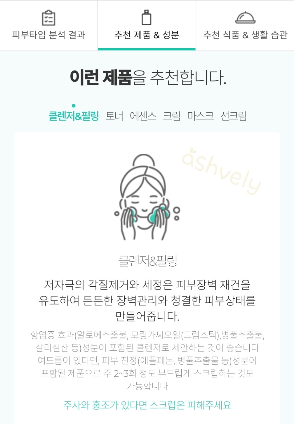피부타입은 총 16가지로 나누어 진다고하는데 저는 OSNW타입이 나왔어용! 심한 민감성, 경미한 지성이라서 홍조, 여드름, 뾰루지, 주름개선을 위한 관리가 필요하다고 하네용~ 요즘 고민인 것들이 다나왔어요!! 요즘 이래서 수분공급+ 진정 아이템들만 주구장창 바르고있는데... 신기하지않나요?>_<